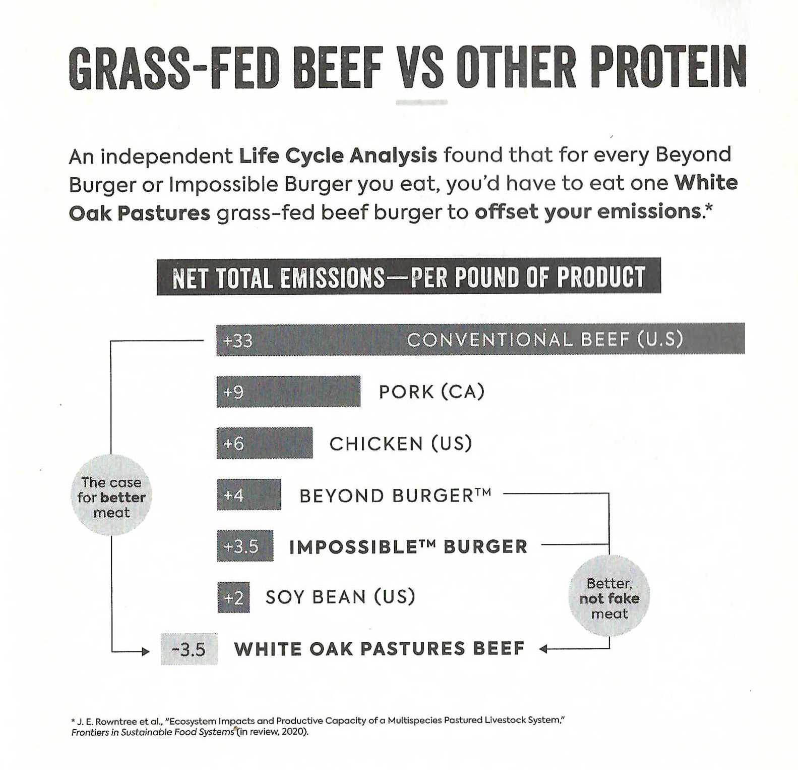 This is a snapshot I took from a book called Sacred Cow: The Case for Better Meat. First it shows that, as we all know, concentrated animal feeding operations (CAFOs), aka "conventional beef," are terrible. Typical beef production is a huge greenhouse gas polluter, with 33 lbs of CO2 emitted for every pound of beef. Not to mention, the animals are miserable, the feedlots poison the watershed through to the ocean, and the product is unhealthy. Plant based proteins like Beyond and Impossible are a lower pollution alternative, but still reliant on intensive monoculture farming, meaning they are not so much a climate solution as a way to slow down the apocalypse. Only one option on the list actually removes carbon from the atmosphere and puts it in the soil, and that is regeneratively raised beef. The 20 year longitudinal, peer-reviewed life-cycle assessment study of White Oak Pastures Regenerative Beef can be found here.