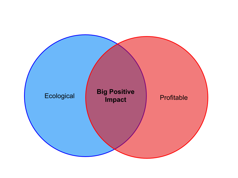 I am looking for “Impact Investments that pass the Mr. Burns Test” (shoutout to my friends at Fifty Years Ventures for pioneering this model). Basically, the companies have to have a strong business model that even the most profit hungry capitalist (aka Mr. Burns from The Simpsons) would love, while also fulfilling goals of ecosystem regeneration and healthy food production. To me, this venn diagram of ecologically sound practice with a profitable business model is the magic combo that makes a good idea scalable to massive positive change in today’s historical reality.